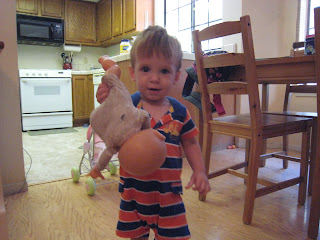 As you can see, Lincoln just keeps growing and growing. He is a busy little monkey and keeps us quite entertained. His vocabulary is not growing as quickly as the girls' but I know in time the grunts will be traded in for words. Sometimes he comes storming into a room, rambles off a bunch of chatter, then just runs out. And despite the vocab, he comprehends a ton! I can hand him something and tell him to put it in his room and he does. When anyone mentions the words "going bye-bye" he runs and grabs his shoes from the basket and so on. He has also been busy getting more teeth lately. He had 8, than 4 more broke through the gums and 2 more will be popping through any day. There you have it, that's what has been happening lately in Lincoln's world.